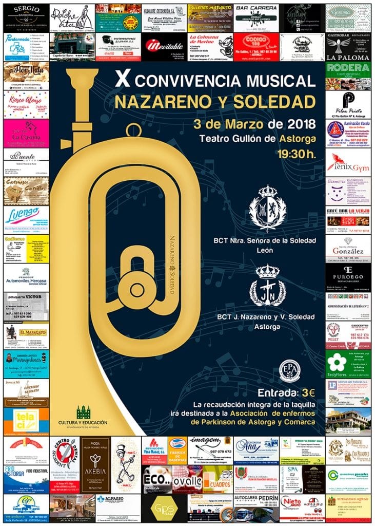 Sí se conocen ya todos los datos de la X Convivencia Musical Nazareno y Soledad; los anfitriones estarán acompañados este año por la Banda de Cornetas y Tambores Nuestra Señora de la Soledad, de León. El evento tendrá lugar el sñabado 3 de marzo a las 19:30 en el Teatro Gullón; el precio de la entrada es de 3 euros, y la recaudación será donada íntegramente a la Asociación de Enfermos de Parkinson de Astorga y Comarca. Las empresas locales que han colaborado con el evento aparecen en el cartel anunciador original: